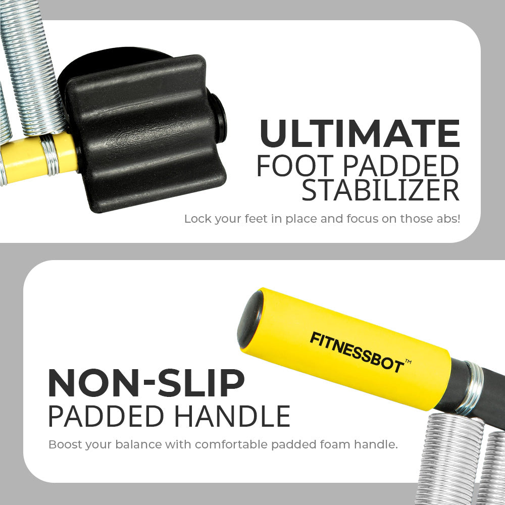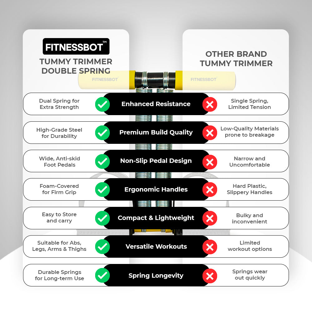 The FitnessBot Double Spring Tummy Trimmer is an excellent tool for fat burning, weight loss, and core strengthening. This tummy trimmer workout device helps you tone your abdominal muscles effectively, offering a smooth resistance with its double spring mechanism. Designed for both men and women, the FitnessBot tummy trimmer is perfect for full-body workouts at home or the gym. The tummy trimmer for men is ideal for targeting the core, while the tummy trimmer for women provides a great workout for shaping and toning the waistline. This versatile tummy trimmer is also available in a tummy trimmer combo and features a rubberized grip for added comfort. Whether you're looking for a tummy trimmer belt or a three spring tummy trimmer, FitnessBot has you covered with the perfect solution for your fitness goals.